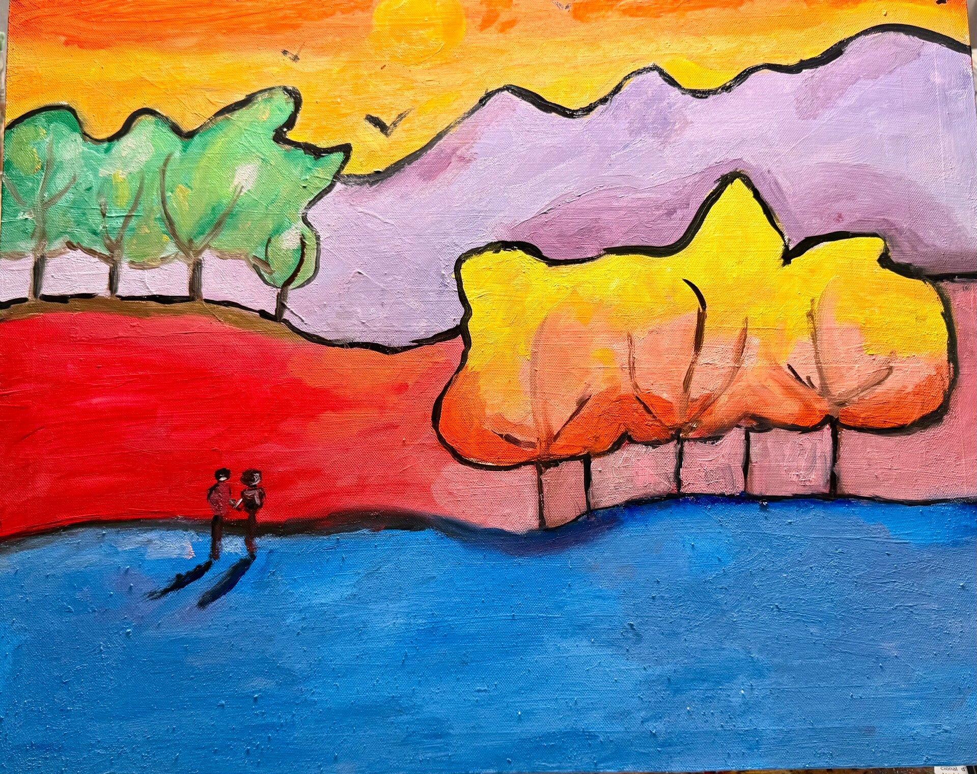 El horizonte está dominado por colinas o montañas, representadas con un audaz tono púrpura y un contorno negro y sinuoso, que contrastan con la frondosa vegetación de colores brillantes: el verde ácido de los árboles a la izquierda y el amarillo intenso de los de la derecha, que parecen arder bajo los últimos rayos del sol. El cielo, pintado con una paleta cálida de naranjas y amarillos, acoge a un pequeño sol y un par de pájaros, sugiriendo un momento de transición y paz.