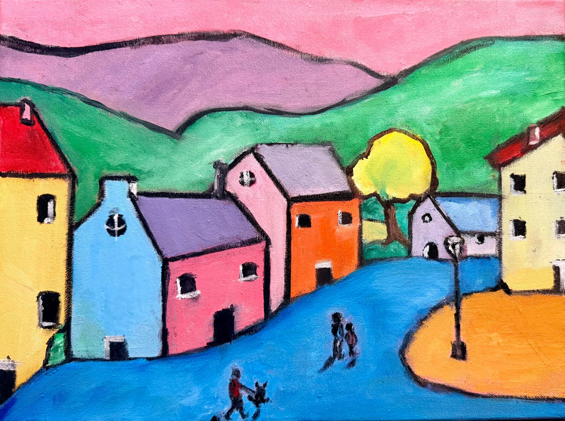 Este óleo sobre lienzo me gustaria invitaros a adentraros en una escena cotidiana cargada de vitalidad y ternura. Las casas, pintadas en tonos vivos, se convierten en protagonistas de un paisaje que evoca la simplicidad y la alegría de los pueblos donde la vida transcurre despacio. El azul del camino conduce la mirada hacia los personajes que pasean, generando un diálogo entre el entorno y quienes lo habitan. Con un estilo que mezcla ingenuidad y fuerza cromática, intento transmitir una sensación de calidez y nostalgia.